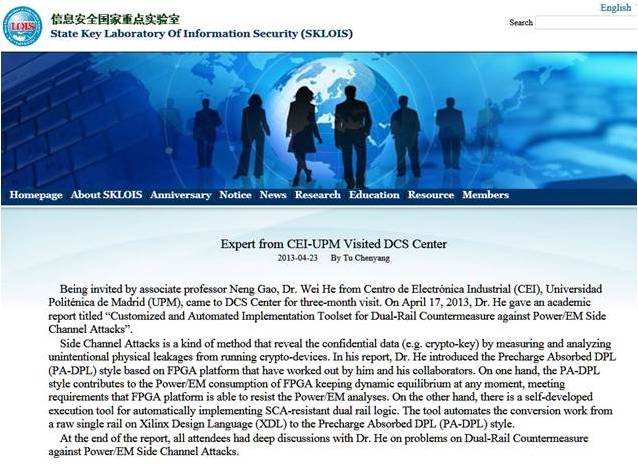 Wei He, researcher of the Digital Embedded Systems group, was invited to give an academic talk on “Customised and Automated Implementation Toolset for Dual-Rail Countermeasure Against Side Channel Attacks” at the Laboratory of Information Security of the Chinese Academy of Sciences, on April 17th.